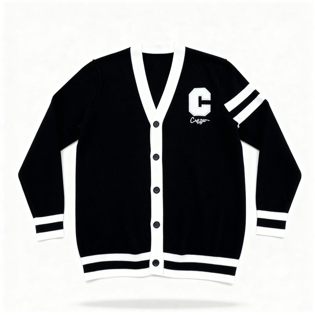 Heritage redefined. The Cuzzo® Sheridan Cardigan blends timeless collegiate style with modern luxury craftsmanship. Designed from a heavyweight knit for warmth and structure, it features a deep black body accented by crisp white trim and a bold “C” chenille patch—a nod to vintage varsity energy elevated through refined design.